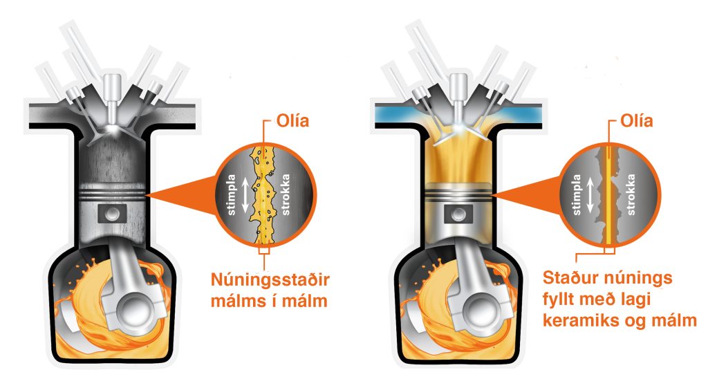 Við mælum með Ceramizer CS, sem byrjar endurnýjunarferlið þegar það er bætt í olíuna og við akstur (vélarvirkni) með því að mynda keramíkmálmlag á núningsflötum. Þetta lag endurbyggir og fyllir upp í slitna fleti stimpilhringja, strokka og leguskála. Keramíkmálmlagið ekki aðeins endurbyggir heldur verndar einnig núningsfleti gegn sliti.