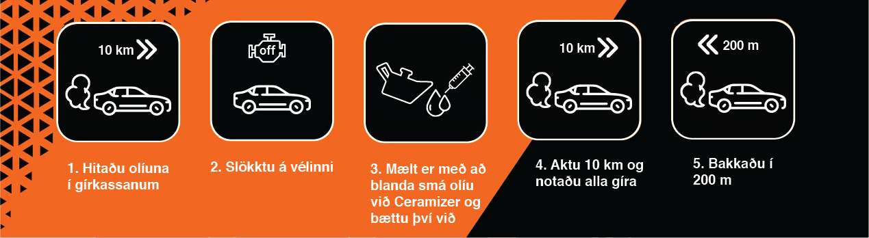 Vert er að taka fram að ferlið fer fram við venjulega notkun gírkassans og er óþurft að taka búnaðinn í sundur. Ceramizer® gírkassaefnaferillinn endurbyggir samstillta, tannhjól og legur.